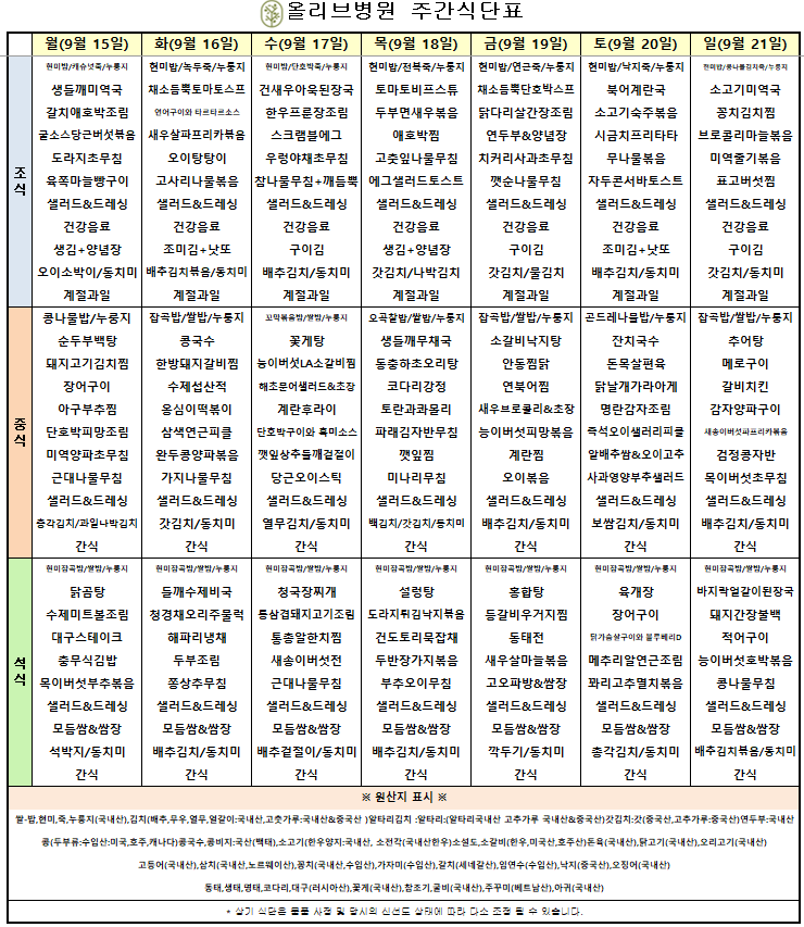 9월 2주차 주간식단표