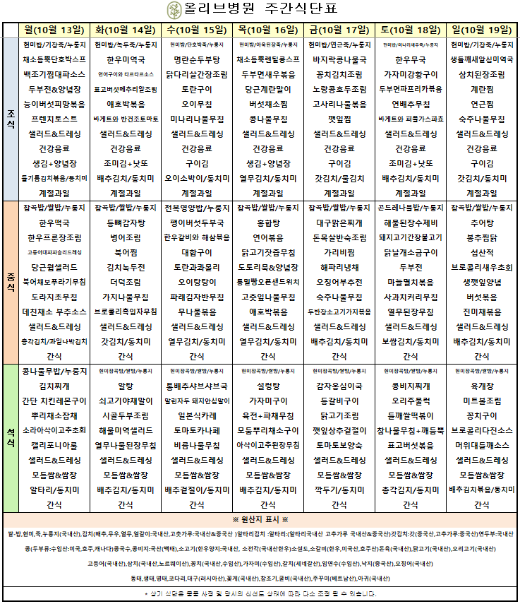 10월 4주차 주간식단표