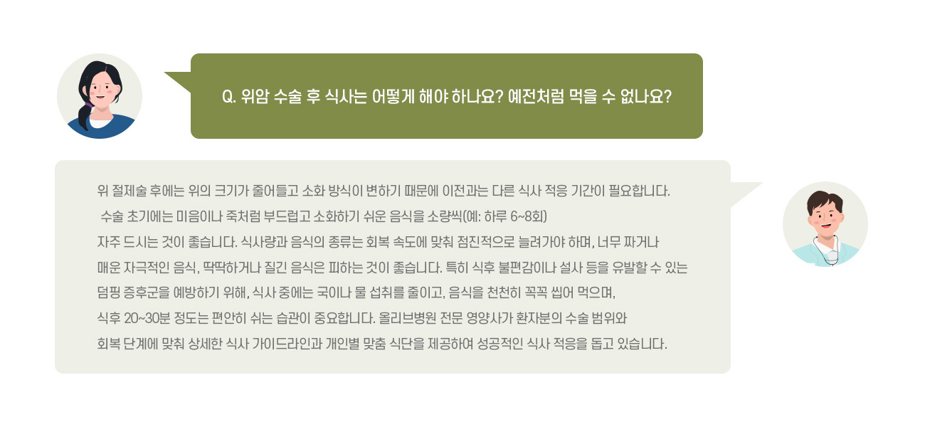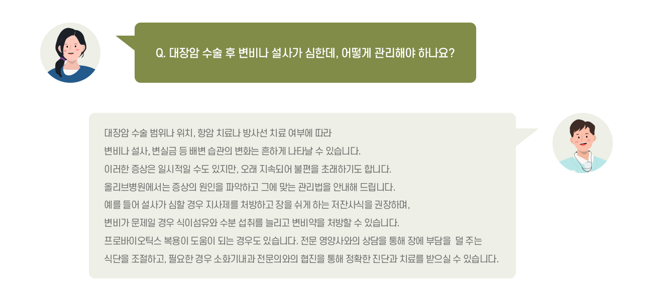 소화기 증상 관리는 소화기내과 전문의 원장님의 진료에서 시작되어 올리브병원 전문 영양사의 1:1 심층 상담으로 이어집니다.